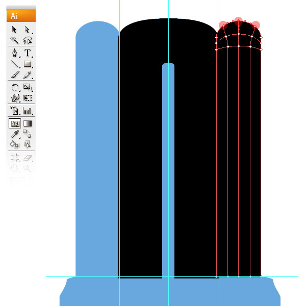 Now this part is going to get tricky. The shape for our first part is ready and now you have to place further mesh anchors, so later on you can colorize it to get a gradient effect into your rod.Place the anchors of the mesh by clicking with the Mesh Tool at the bottom edges to get vertical divisions. Also add another two diagonal divisions in the curve as you can see below. This helps to give a more detailed look to the mesh gradient.